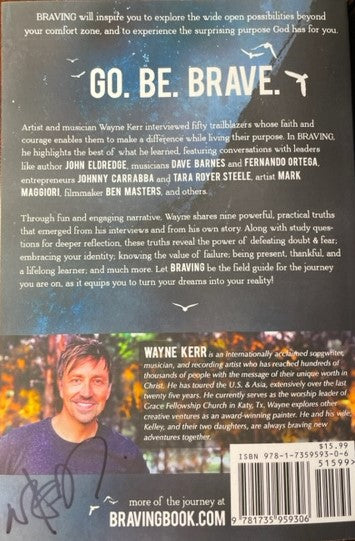 El artista y músico Wayne Kerr entrevistó a cincuenta pioneros cuya fe y coraje les permiten marcar la diferencia mientras viven su propósito. En Braving, destaca lo mejor de lo que aprendió, presentando conversaciones con el autor de la vida de líderes John Eldridge, el músico Dave Barnes y Fernando Ortega, los empresarios Johnny Carrabba y Tara Royer Steele, el artista Mark Maggiori, el cineasta Ben Masters y otros.