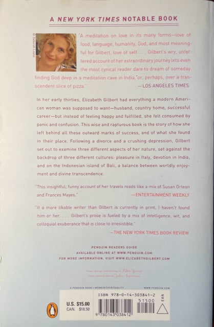 Cuando tenía poco más de treinta años, Elizabeth Gilbert tenía todo lo que una mujer estadounidense moderna se suponía que deseaba: marido, casa de campo, carrera exitosa, pero en lugar de sentirse feliz y realizada, se sentía consumida por el pánico y la confusión. Este libro sabio y entusiasta es la historia de cómo dejó atrás todas estas marcas externas de éxito y de lo que encontró en su lugar. Tras un divorcio y una depresión aplastante, Gilbert se propuso examinar tres aspectos diferentes de su naturaleza, en el contexto de tres culturas diferentes: el placer en Italia, la devoción en la India y, en la isla indonesia de Bali, un equilibrio entre el disfrute mundano y y la trascendencia divina.