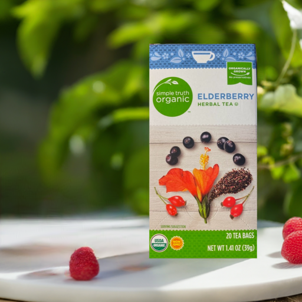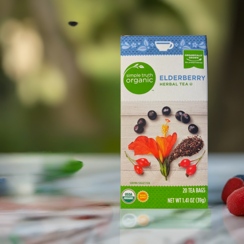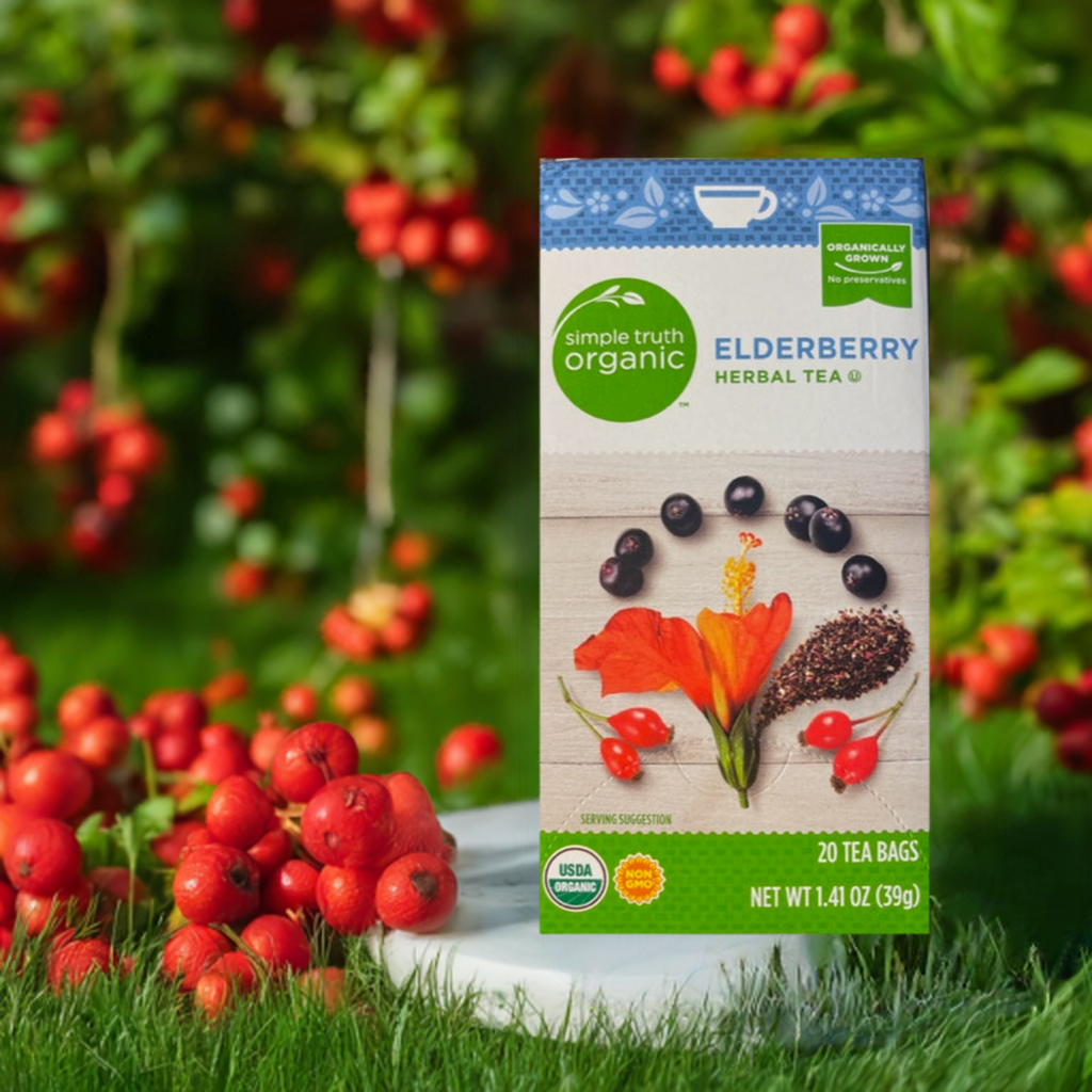 Made from a luscious blend of hibiscus, rose hips and elderberry enhanced by aromatic licorice and orang peel, our Simple Truth Organic Elderberry Herbal Tea is delicious hot or iced.