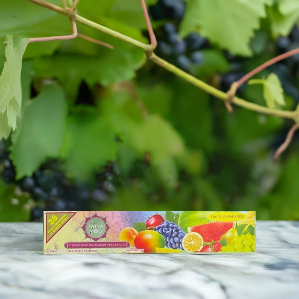 Indulge in a sensory experience with Incense Sticks Tatva Fruits of Paradise. With 7 tantalizing fragrances, including cherry, peach, and mango, these sticks will infuse your home with the fresh scents of nature. Each box contains 28 sticks, perfect for elevating your space. Enhance your atmosphere with this luxurious addition.